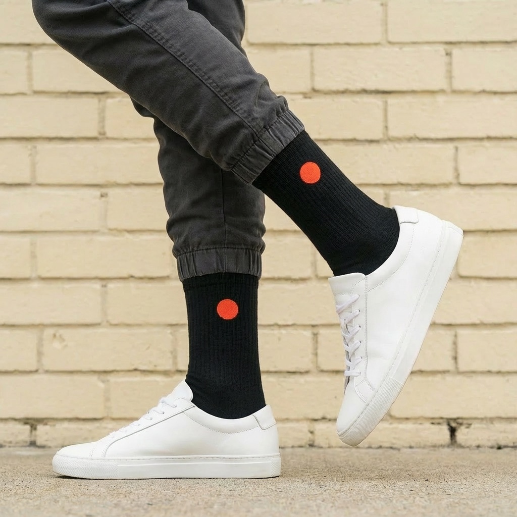 Premium mid-length crew socks with a printed GAS single dot, a symbol of completion. Every step counts.
